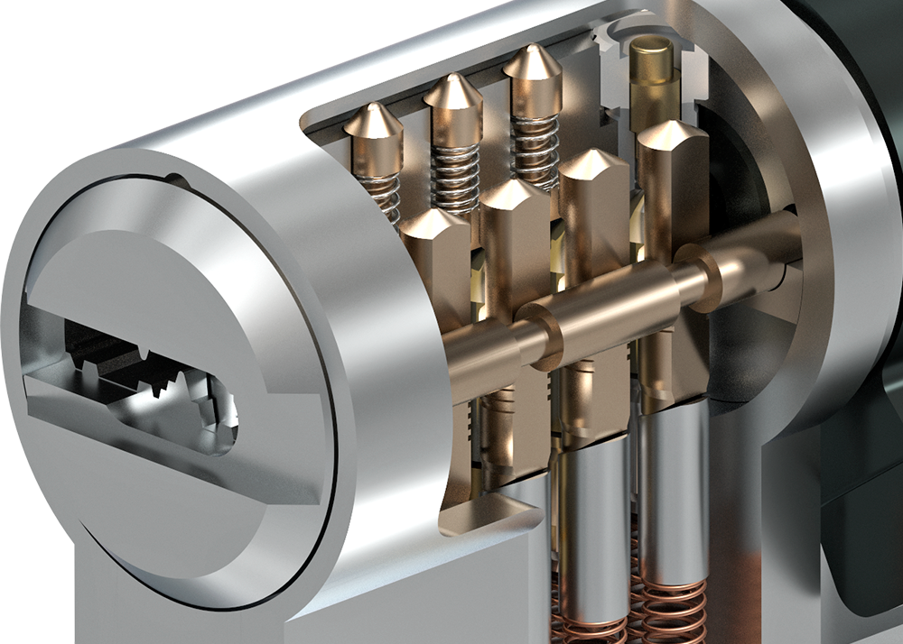 Сталеві загартовані штифти в корпусі циліндру є першим захистом від висвердлювання блокуючих пінів і опорних пружин. Вони виготовлені зі сталі з загартуванням до HRC 58 ± 5 і покриті зовнішнім комбінованим шаром (NiCuFe).